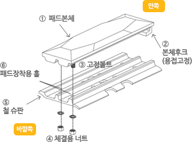 • ÀåÂø¼ø¼­ 1. ¨èº»Ã¼ÈÄÅ©¸¦ ¨ë½´ÆÇ(steel shoe plate) ¾ÈÂÊ¿¡ ³¢¿ö ³ÖÀ¸¸ç ¨é°íÁ¤º¼Æ®¸¦ ¨ìÆÐµåÀåÂø¿ë Ȧ¿¡ ¸ÂÃß¾î ³Ö´Â´Ù. 2. ¨é°íÁ¤º¼Æ®¿¡ ÁöÁ¤µÈ ÅäÅ©·Î ¨êü°á¿ë ³ÊÆ®·Î ´Ü´ÜÈ÷ °íÁ¤ÇÑ´Ù. (Åäũǥ ÂüÁ¶) 3. ±âü¸¦ Àü ÈÄÁø ÇÒ °æ¿ì ´Ù½Ã ÁöÁ¤µÈ ÅäÅ©·Î ³ÊÆ®¸¦ °íÁ¤ÇÑ´Ù. 4. ¿Ï·á